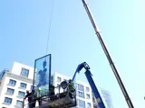 Finally the sun rises and we can get back to it, everyone knows the plan and is now familiar with how it will play out. The new glass turns up on the van, they take it off and attach the vacuum powered glass sucker to it and proceed to lift the glass to the 10th floor. As it aproaches the empty hole. The team in the mewp carefully guide it into its new home, while the crane’s banksman ensures the crane is not too low for the glass or too high that it touches the metal artwork above.
