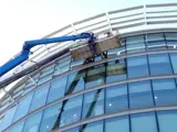 Time to get our hands dirty, our next step was to go up in the mewp, attach the vacuum glass sucker to the defective pane, remove all the fixings, release the glass and then lower to the floor ready to on the van ready for recycling!